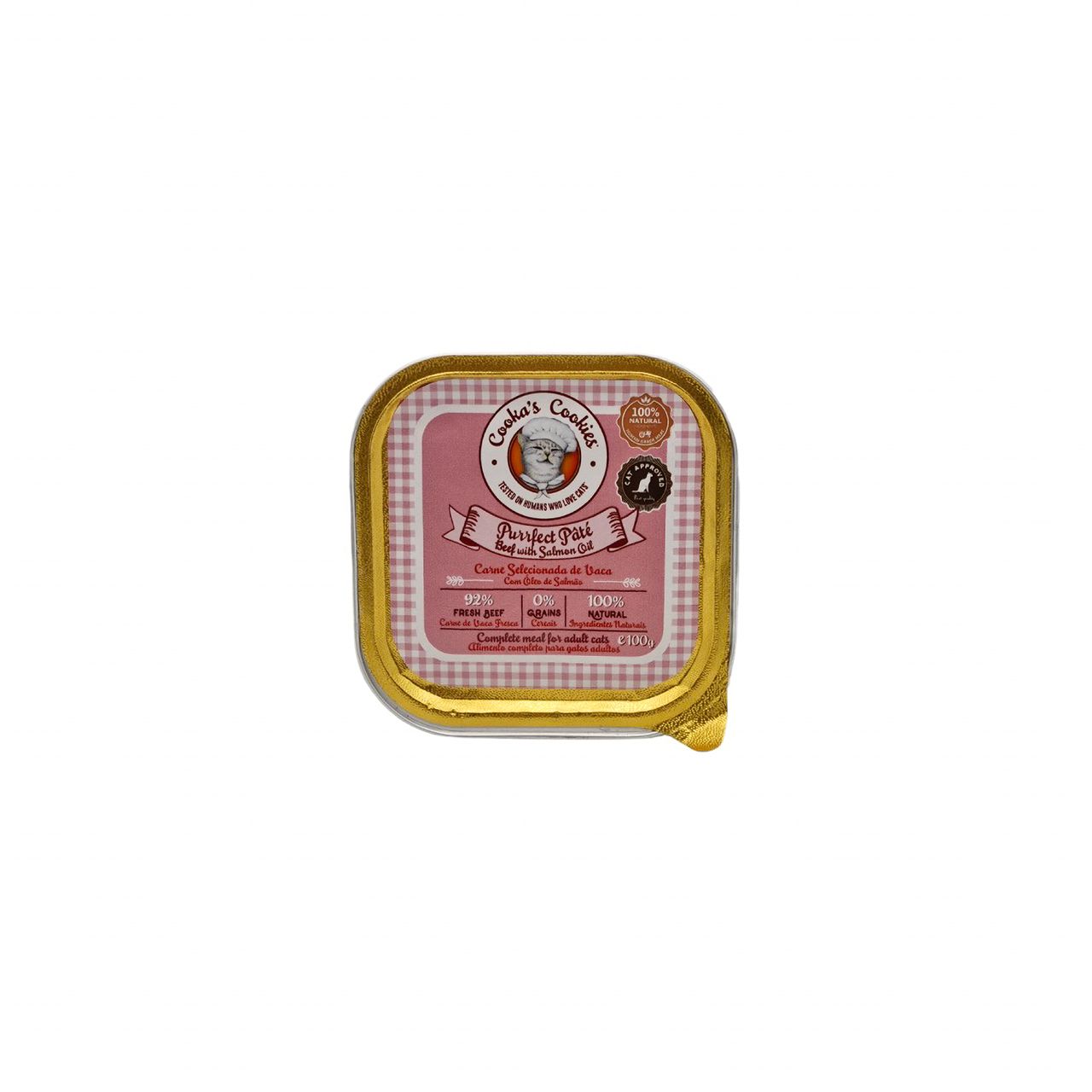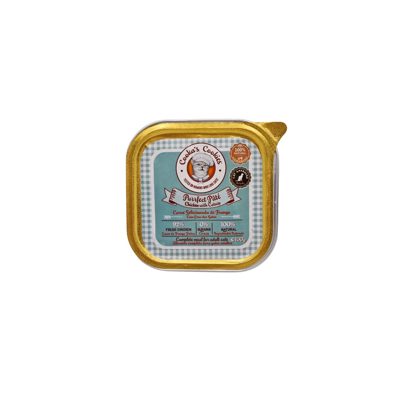 Alimento húmido para gatos formulado e cozinhado sem aditivos ou conservantes, fabricado em Portugal.