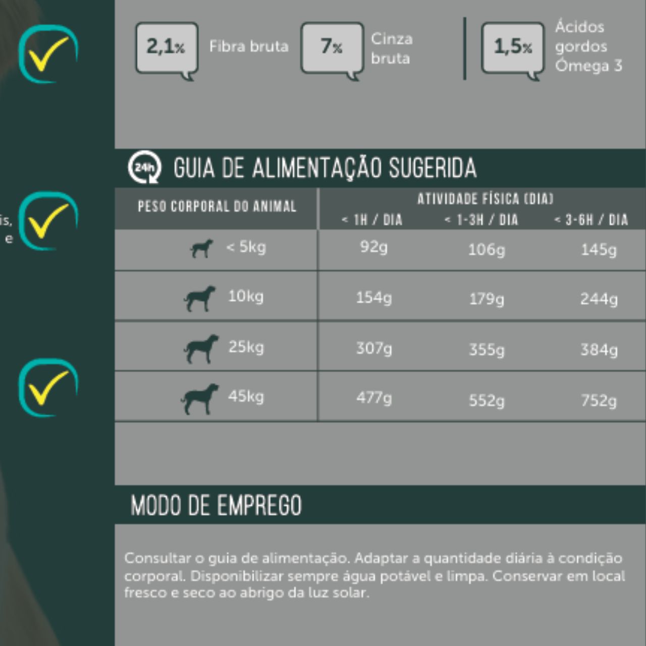 Conselhos de utilização: administrar nas quantidades indicadas na tabela da ração diária. Garantir sempre água fresca à disposição. Disponibilizar o novo alimento alternadamente e gradualmente com o antigo. Conservar a embalagem bem fechada em local seco e fresco e ao abrigo da luz solar. Validade de 18 meses.