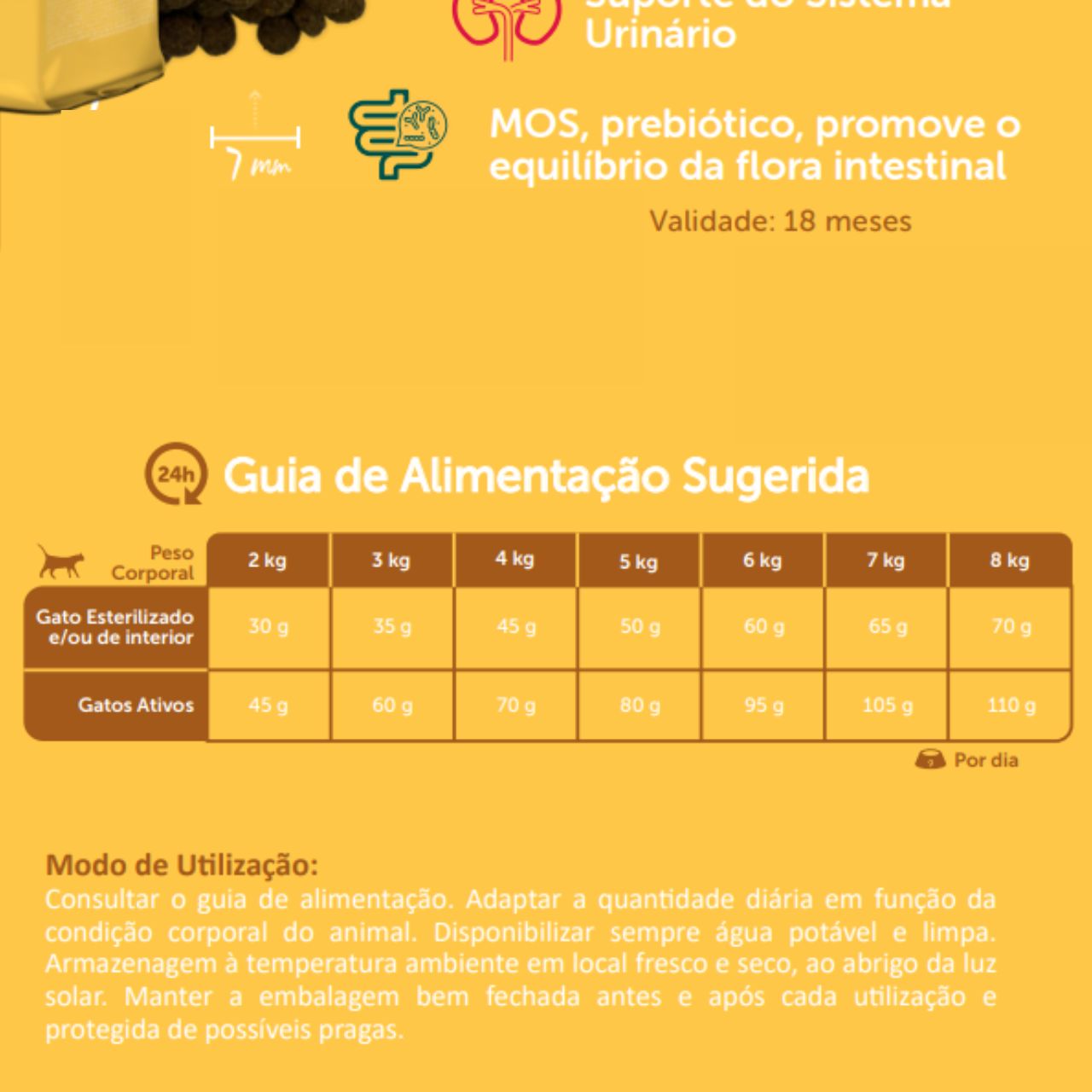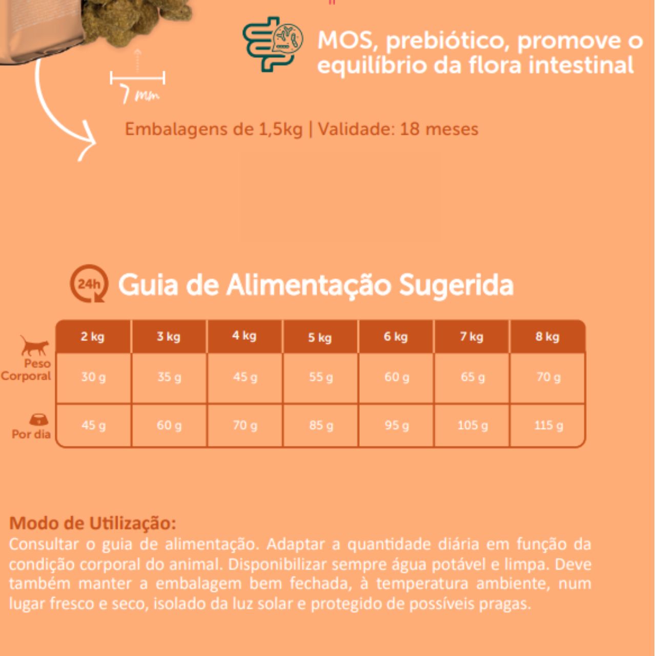 Conselhos de utilização: adaptar a quantidade diária à condição corporal e quantidades indicadas na embalagem. Garantir sempre água potável e fresca à disposição. Conservar em local seco e fresco e ao abrigo da luz solar. Fechar bem a embalagem após utilização.