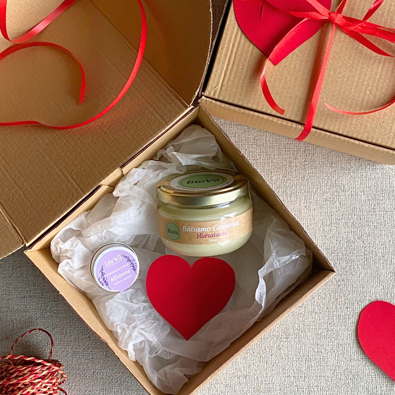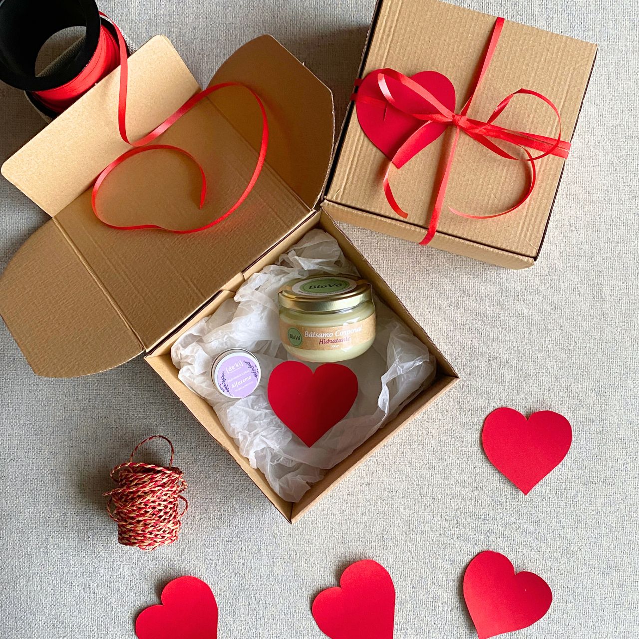 Inclui: 1 Caixa presente com laço decorativo, 1 Bálsamo Labial 5g (aroma Alfazema), 1 Bálsamo Corporal 100g (aroma Alfazema) e 1 cartão em forma de coração feito à mão para mensagem especial.