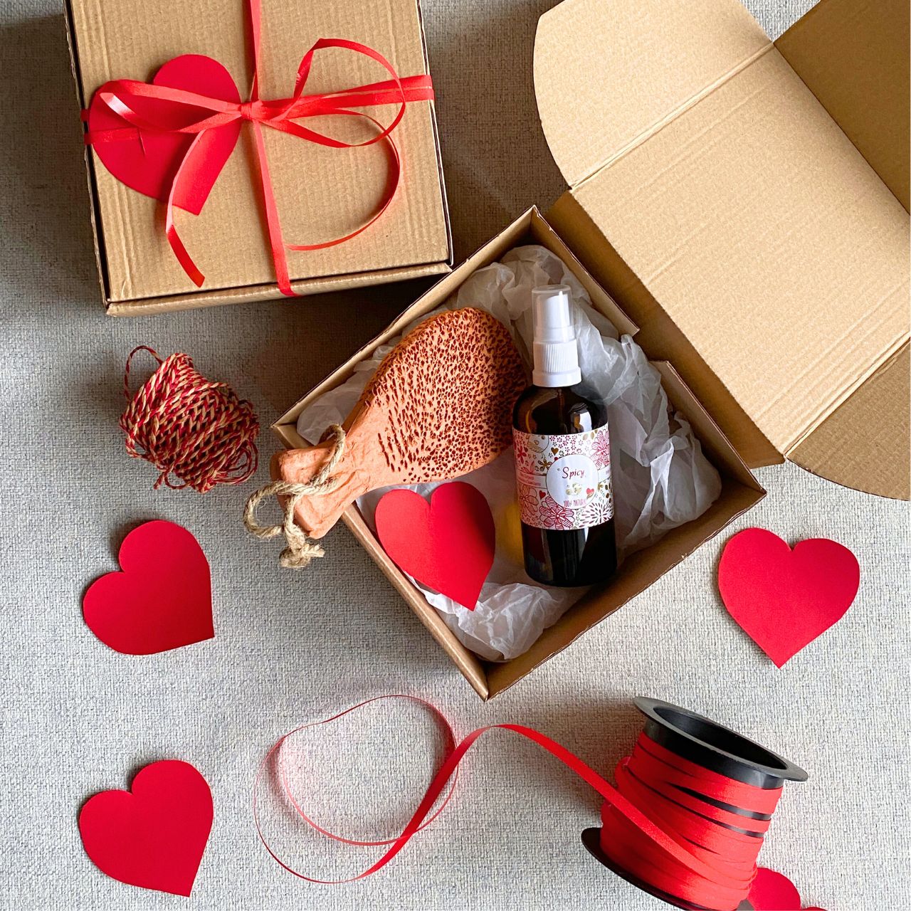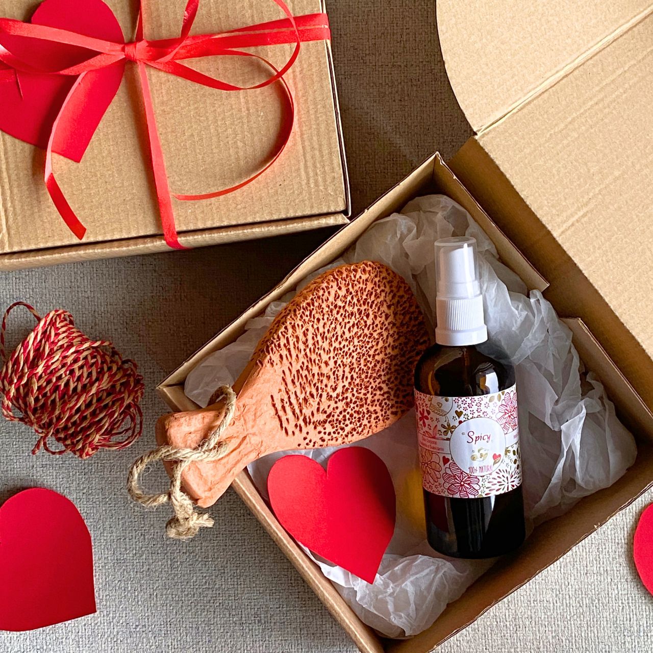 Inclui: 1 Caixa presente com laço decorativo, 1 Óleo Corporal Exótico 100mL, 1 Escova de Cerâmica Esfoliante e 1 cartão em forma de coração feito à mão para mensagem especial.