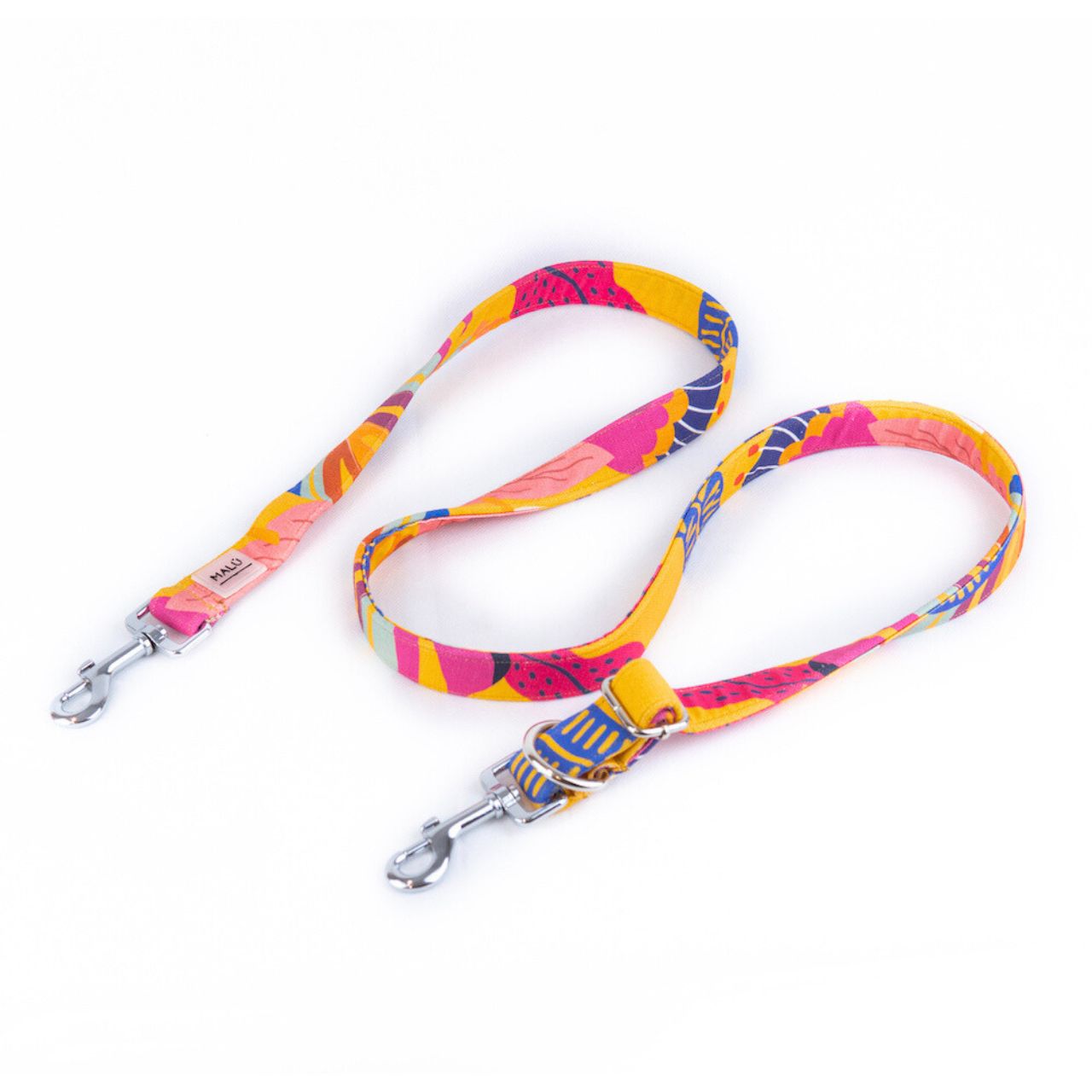 Composição: Cinto – ajustável e com meia-lua soldada. Trela Múltipla - com 25mm de espessura, ajustável entre 90cm a 160cm, com uma meia-lua, mosquetão e pega, pelo que pode também ser utilizada como trela separada do cinto. Todos os artigos do conjunto são elaborados artesanalmente a partir de uma fita de nylon forrada com tecido no mesmo padrão para que combinem.