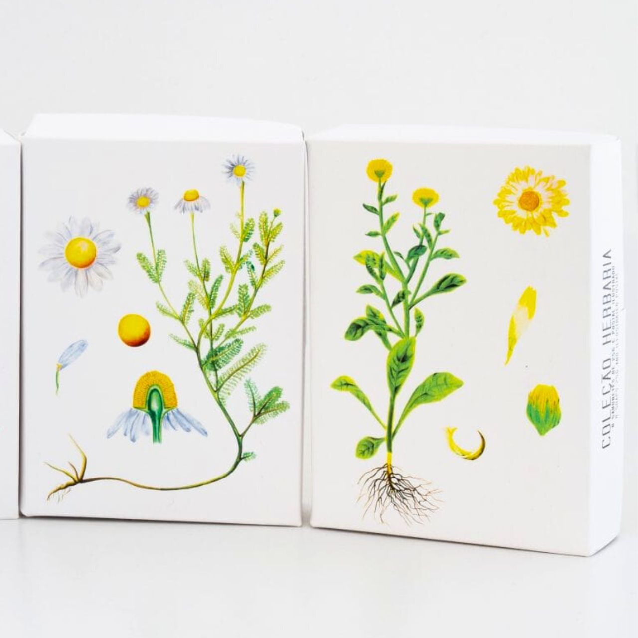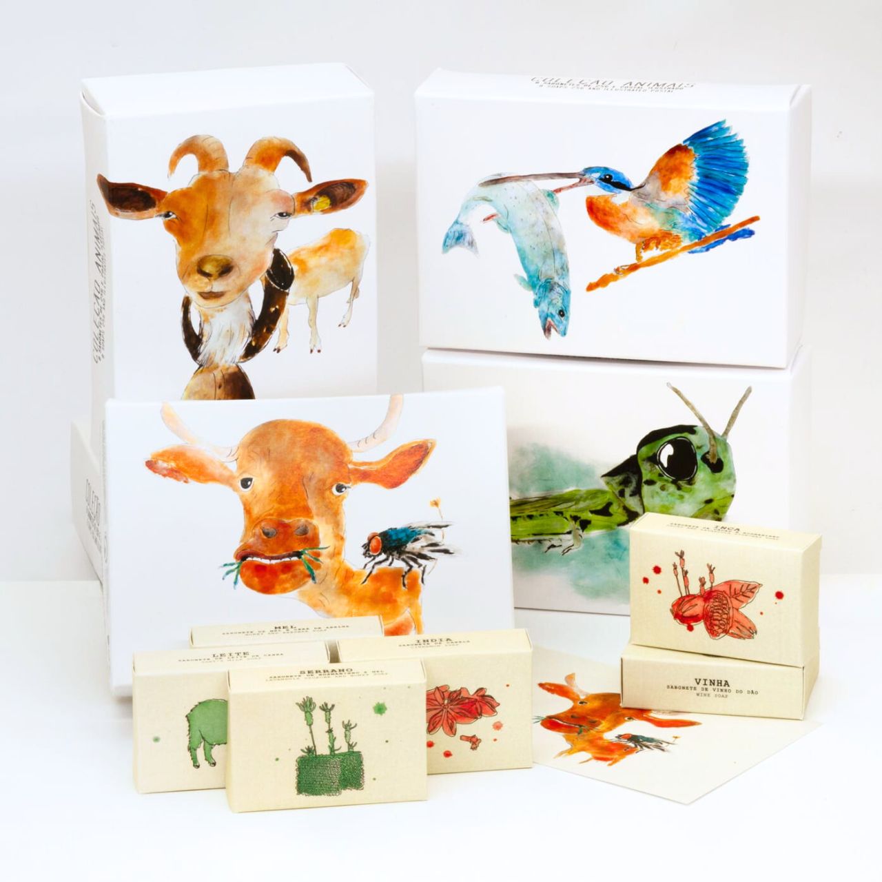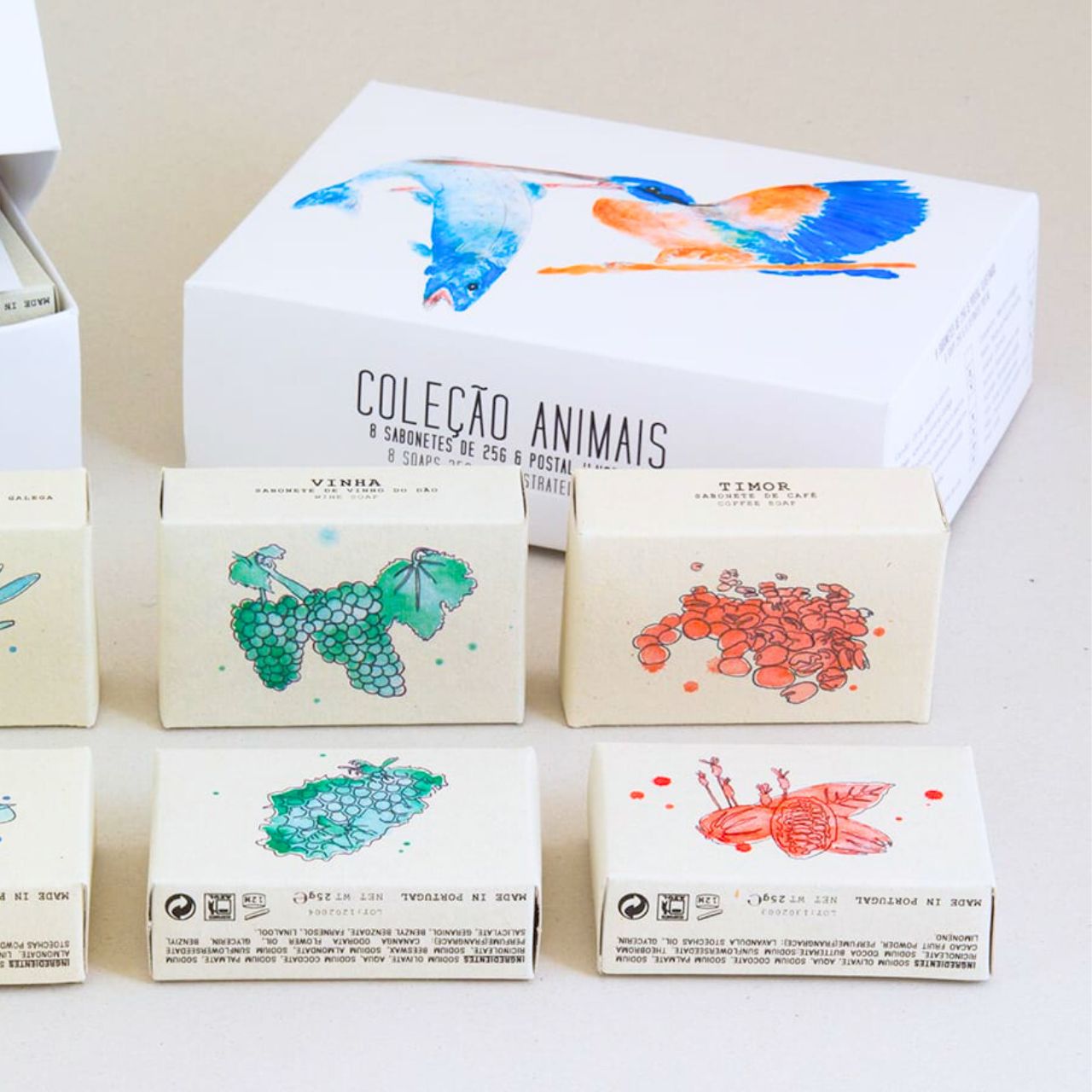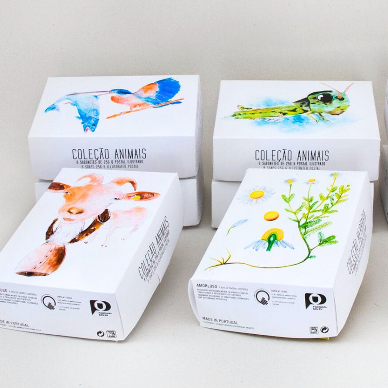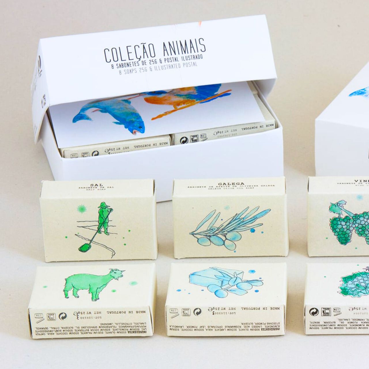 Disponíveis para encomenda à unidade composta por 1 caixa presente com 8 unidades de sabões de 25g com as seguintes opções de ilustrações na caixa: Grilo, Cabra, Vaca, Guarda-rios, Camomila ou Calêndula. Todas as caixas incluem ainda um postal ilustrado dentro da mesma temática.