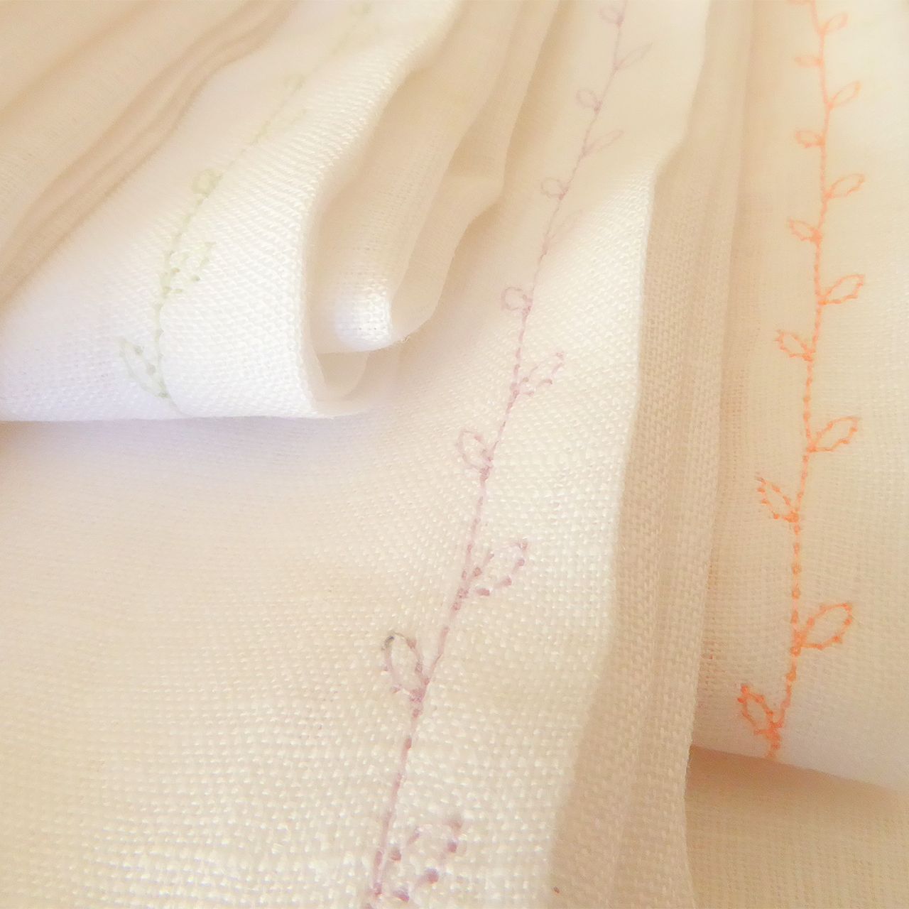 Fabricados à mão em atelier artesanal em Portugal, são quadrados de tecido recondicionado da indústria têxtil de cor neutra, com uma costura em cores sortidas, simples ou decorativa.