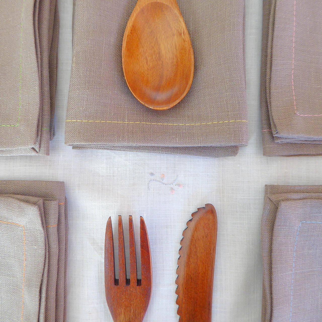 Disponível para encomenda em conjuntos de 4, 8 ou 12 unidades, com costuras simples ou decorativas em cores sortidas. Talheres e acessórios apresentados nas imagens, não incluídos.