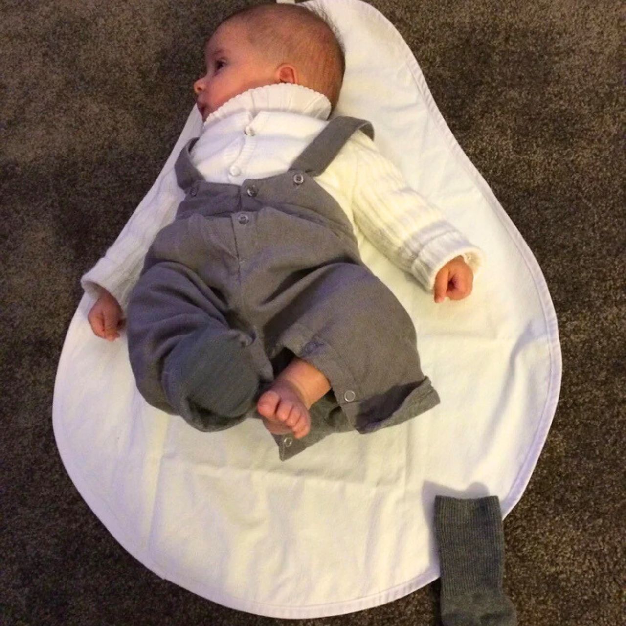 O formato exclusivo do muda-fraldas foi pensado para uma troca de fralda adequada a todos os bebés. Os bebés pequenos cabem dentro do muda-fraldas e os grandes mantêm os sapatinhos fora do tecido prevenindo que se suje.