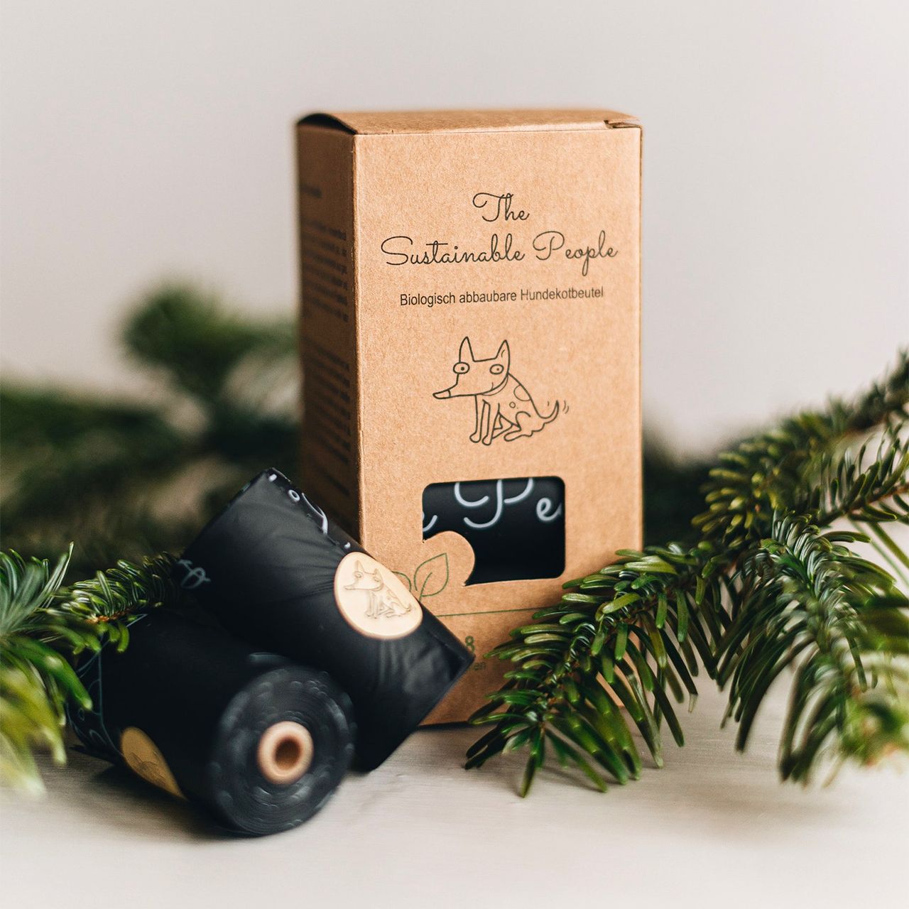Sacos enrolados em rolo de cartão e embalagem exterior em cartão, ambos provenientes de florestas certificadas por FSC, reutilizáveis e recicláveis.